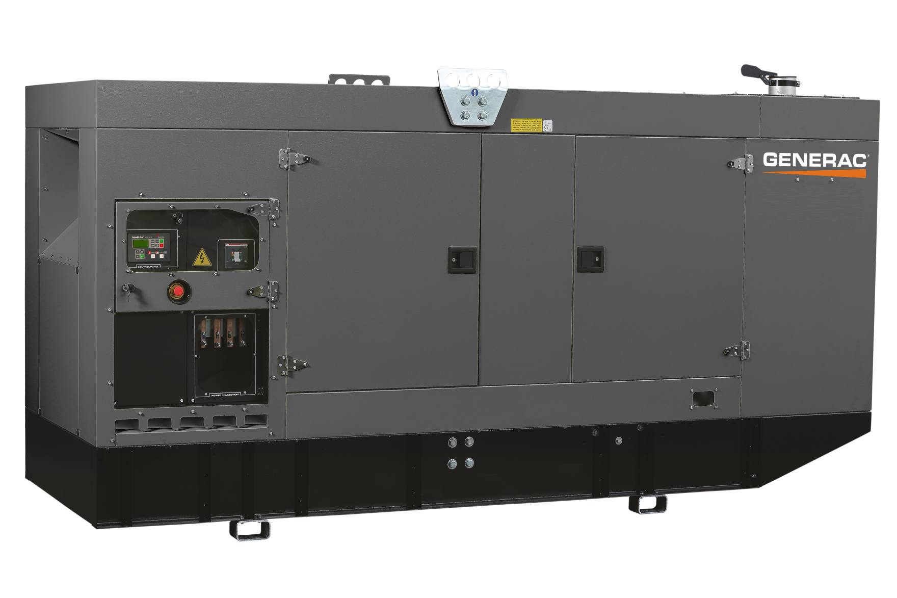 Generac range of industrial diesel generators in canopy version, with central lifting point/roof mounted lifting plates; compact design with integrated plastic fuel tank, exhaust silencer with rain flap and coolant refilling facility.